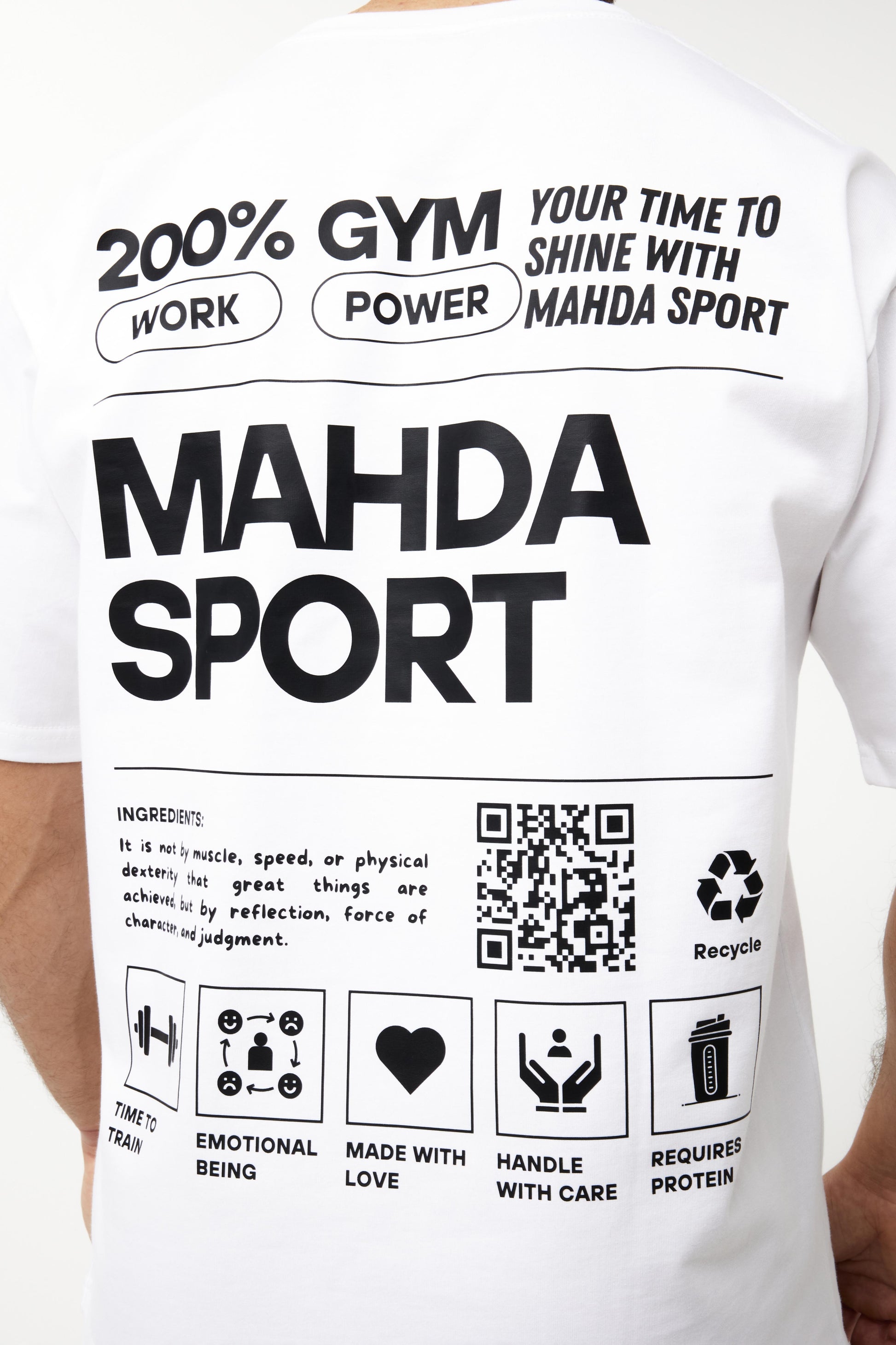 Maak kennis met het perfecte oversized katoenen shirt, speciaal ontworpen voor wie stijl en functionaliteit zoekt. Dit shirt is gemaakt van 100% hoogwaardig katoen en biedt de ultieme combinatie van comfort, een relaxte fit en een uniek design. Op de achterkant vind je een opvallende grote print met inspirerende teksten om je te motiveren bij je fitnessdoelen. Maar dat is niet alles: scan de exclusieve QR-code en krijg direct toegang tot meer informatie. Haal het meeste uit je workouts!